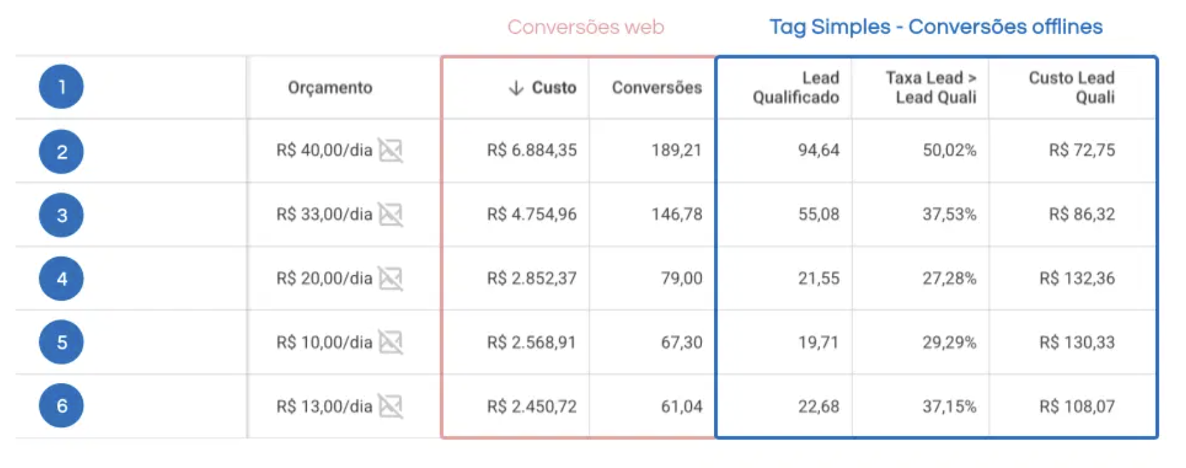 No caso do Tag Simples, configuramos para que os eventos personalizados de qualificação e ganho, que normalmente ficariam presos no CRM, sejam devolvidos automaticamente como conversões personalizadas nas plataformas de mídia. Assim, você vê através das colunas qual anúncio trouxe apenas leads e qual entregou, de fato, clientes.