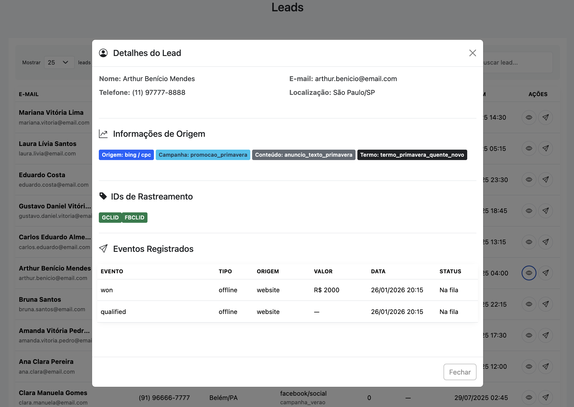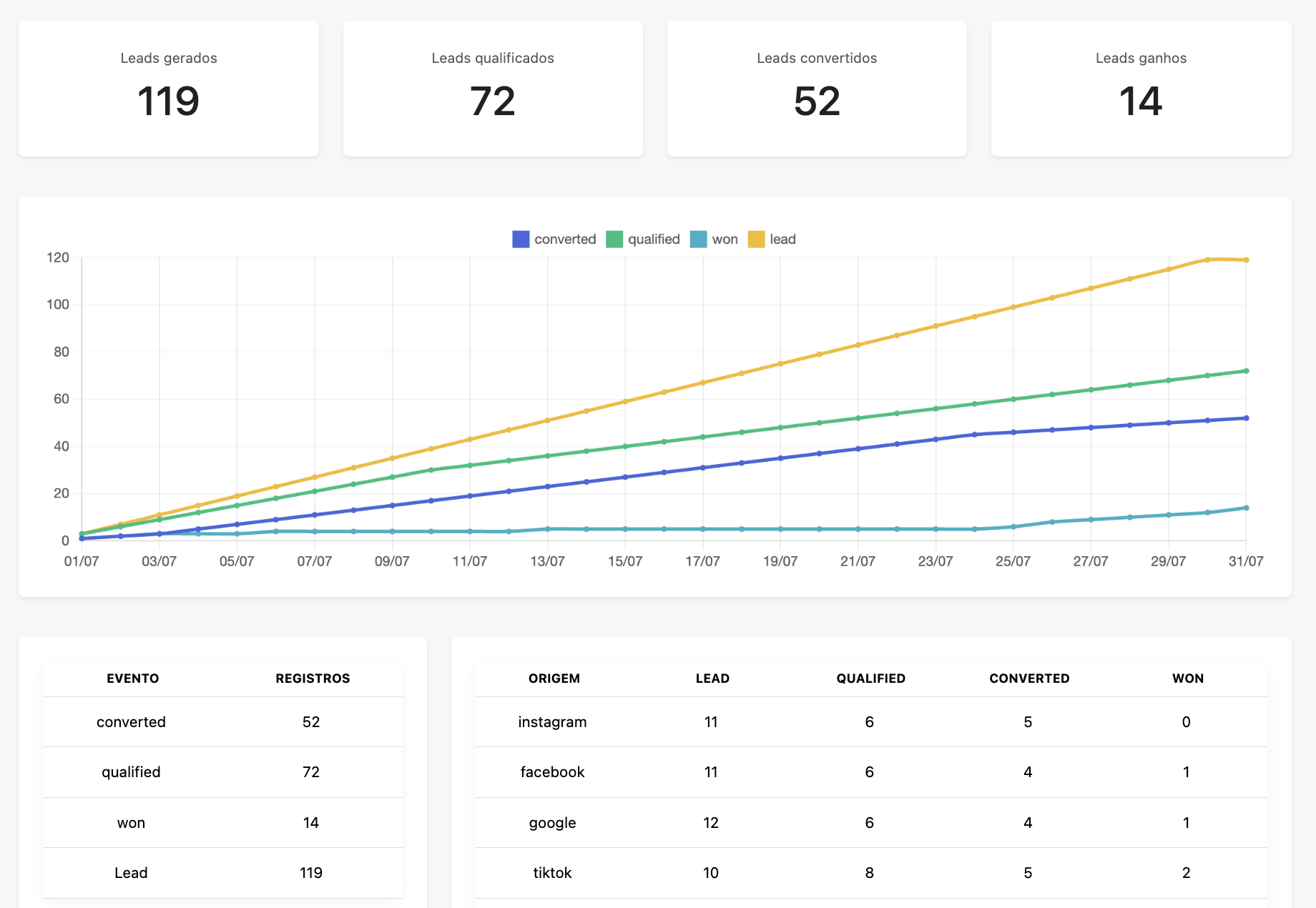 - Etapa do funil do lead: novo, qualificado, convertido ou ganho